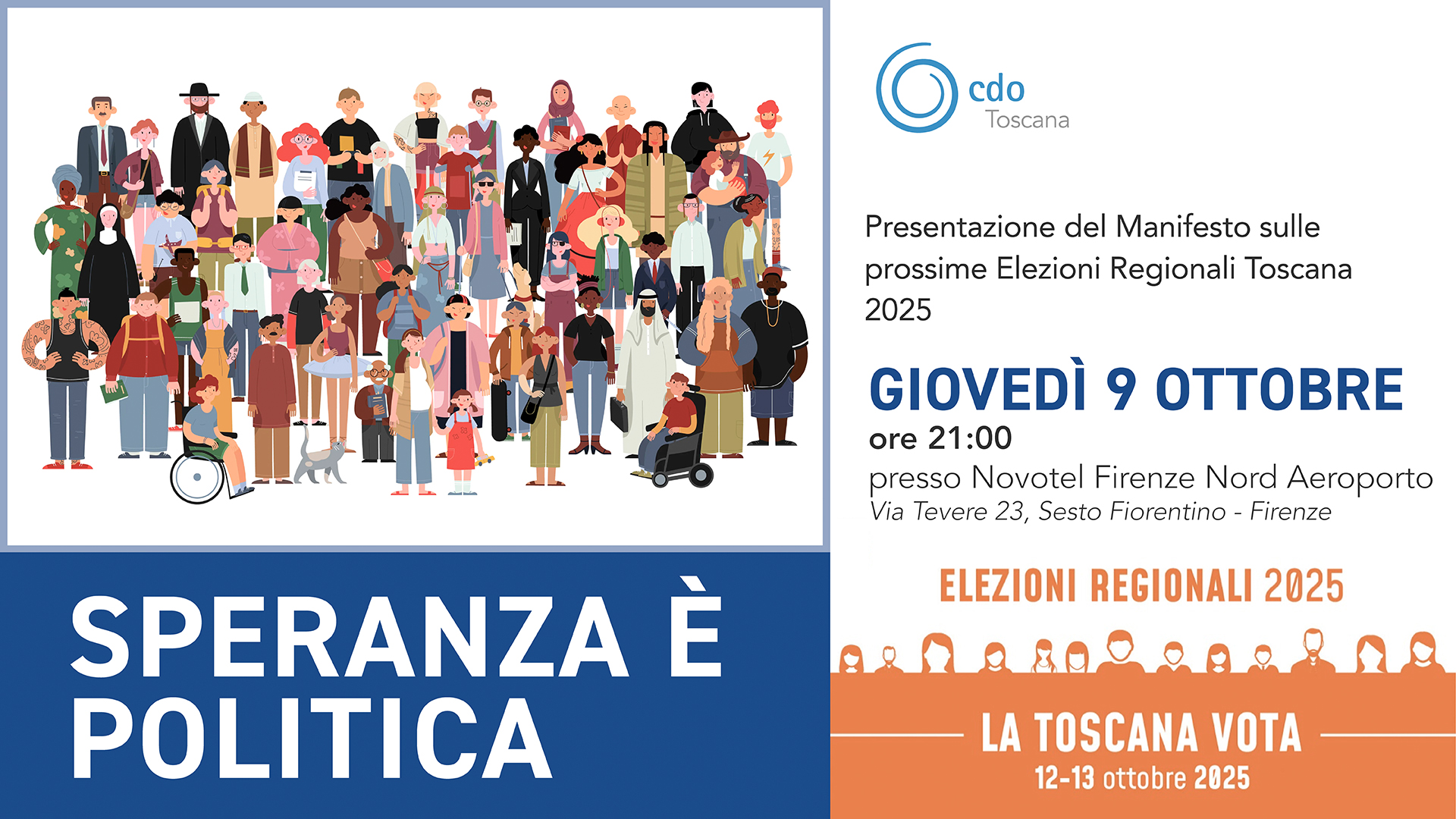 In un tempo segnato da sfiducia e disorientamento, parlare di politica come luogo della speranza può sembrare un paradosso. Eppure è proprio da questa convinzione che nasce “Speranza è politica”, il manifesto che la Compagnia delle Opere Toscana presenterà giovedì 9 ottobre a Firenze: un documento che vuole rilanciare il senso dell’impegno civico e proporre piste di lavoro concrete per la prossima consiliatura regionale.